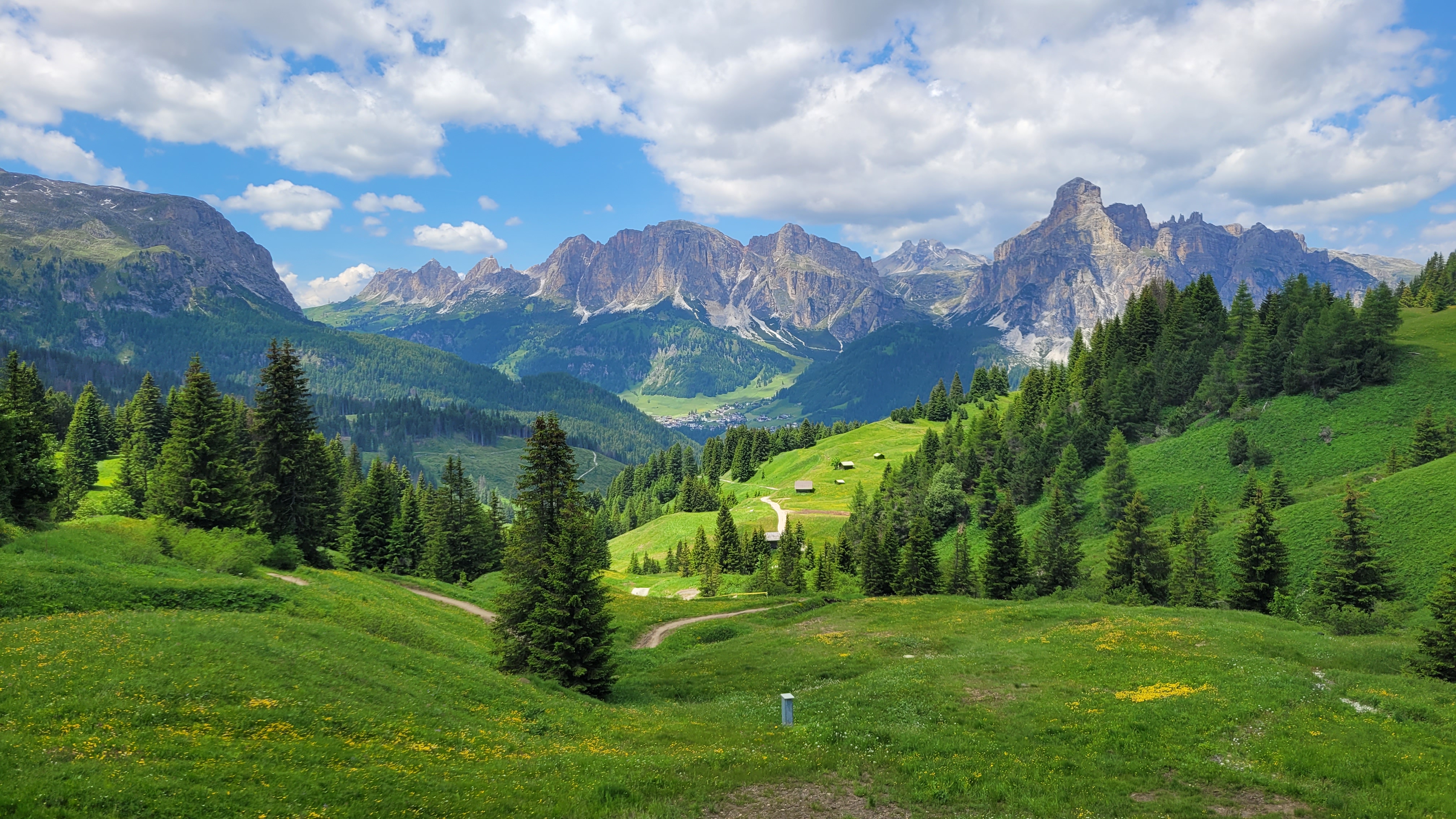 Vi börjar mjuka upp våra kroppar för de nästkommande dagarna med en vandring, där vi lär oss lite om historian i området. Denna dag vandrar vi alla tillsammans (endast en grupp). Vi tar bussen en kortare sträcka för att utforska Fodomdalen med sina intressanta små byar och vackra natur. Denna tur är speciellt bra om det är mycket varmt, då vi går mestadels i skuggan av en uråldrig lärk- och pinjeskog, eller om sämre väder gör att man inte kan vandra på högre höjd. Masarei, Cherz, Contrin, heter några av de små byar och gårdar vi passerar och som kännetecknar sydtyrolens lantbrukstraditioner. Även om vandringen går på sluttningarna längs dalen, så har man riktigt fina vyer över flertalet toppar. Vi äter vår medhavda lunch i någon av de små byarna vi passerar. En lugn och härlig vandring med ett historiskt och kulturellt perspektiv.