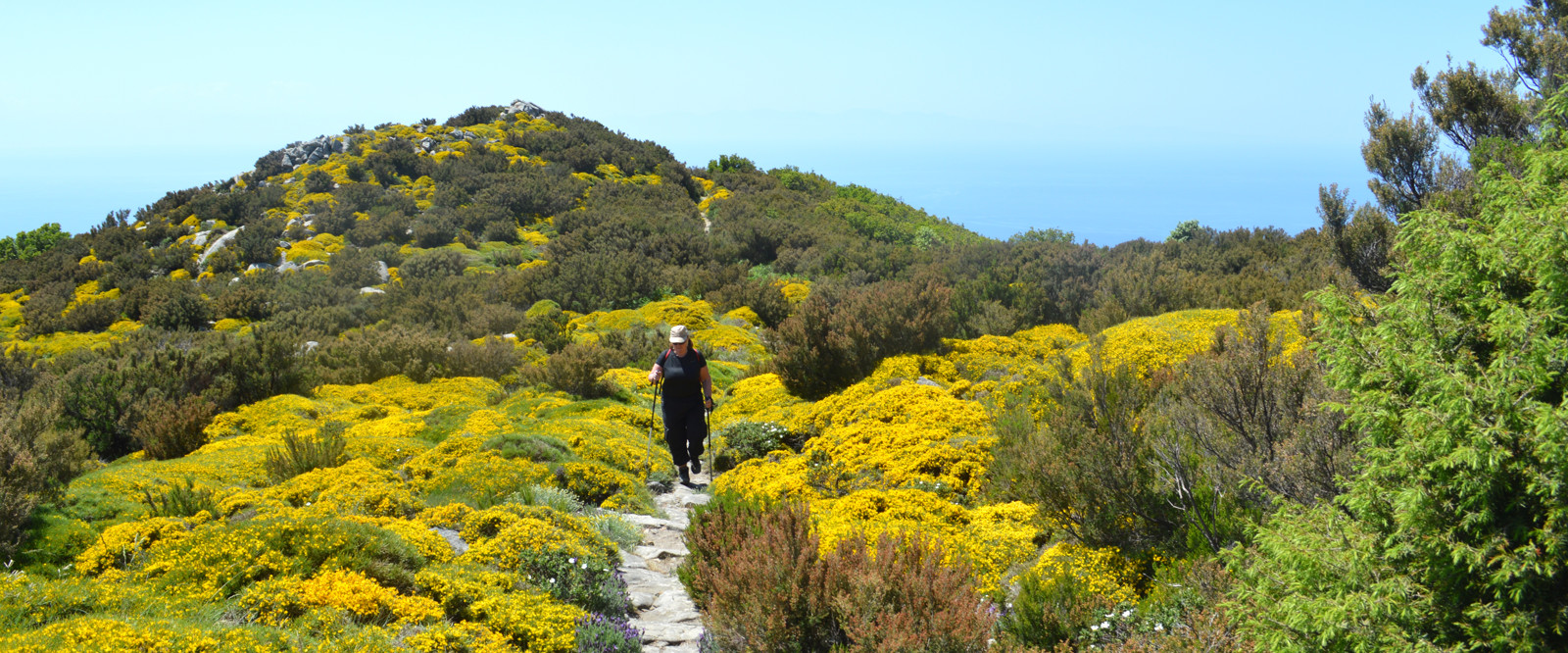 Vår buss tar oss till bergsbyn Marciana Alta som ligger på en höjd av 375 möh och är därmed öns högst belägna by. Det är också en av öns äldsta byar vilket den antika fästningen vittnar om och där man tog skydd från pirater. Gränderna är mycket smala och i utkanten av byn börjar den breda, stenlagda stigen (Via crucis) som leder förbi 14 små kapell upp till kyrkan Madonna del Monte på 600 meters höjd. Kyrkan ligger precis nedanför toppen Monte Giove, en del av bergskedjan Monte Capanne. Kyrkan (troligen från 1500-talet) är ganska blygsam, men i dess omgivning finner man fina vyer över den nordvästra kusten och Sant’ Andrea. Här finns också ett ermitage, där Napolenon vistades med sin Maria Walewska samt en källa med friskt vatten att läska sig av. Vägen kantas till stor del av kastanjer och akaciaträd som skänker skugga en varm dag. Vi fortsätter den lättgångna stigen och gör en liten ”detour” för att beundra utsikten vid ett område av intressanta klippformationer På våren fullständigt exploderar ön i gult av buskar som ginst och här möter vi typisk medelhavs ”macchia.