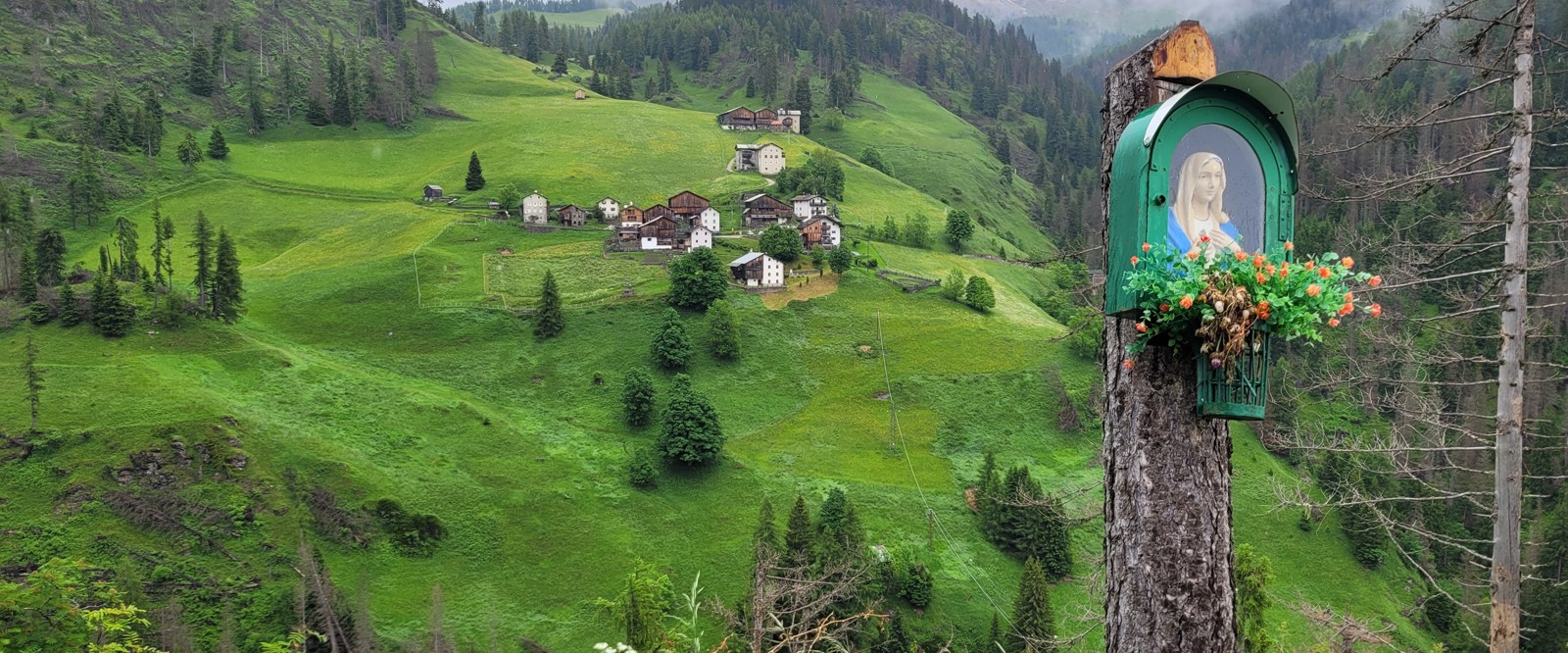 Vi börjar mjuka upp våra kroppar för de nästkommande dagarna med en vandring, där vi lär oss lite om historian i området. Denna dag vandrar vi alla tillsammans (endast en grupp). Vi tar bussen en kortare sträcka för att utforska Fodomdalen med sina intressanta små byar och vackra natur. Denna tur är speciellt bra om det är mycket varmt, då vi går mestadels i skuggan av en uråldrig lärk- och pinjeskog, eller om sämre väder gör att man inte kan vandra på högre höjd. Masarei, Cherz, Contrin, heter några av de små byar och gårdar vi passerar och som kännetecknar sydtyrolens lantbrukstraditioner. Även om vandringen går på sluttningarna längs dalen, så har man riktigt fina vyer över flertalet toppar. Vi äter vår medhavda lunch i någon av de små byarna vi passerar. En lugn och härlig vandring med ett historiskt och kulturellt perspektiv.