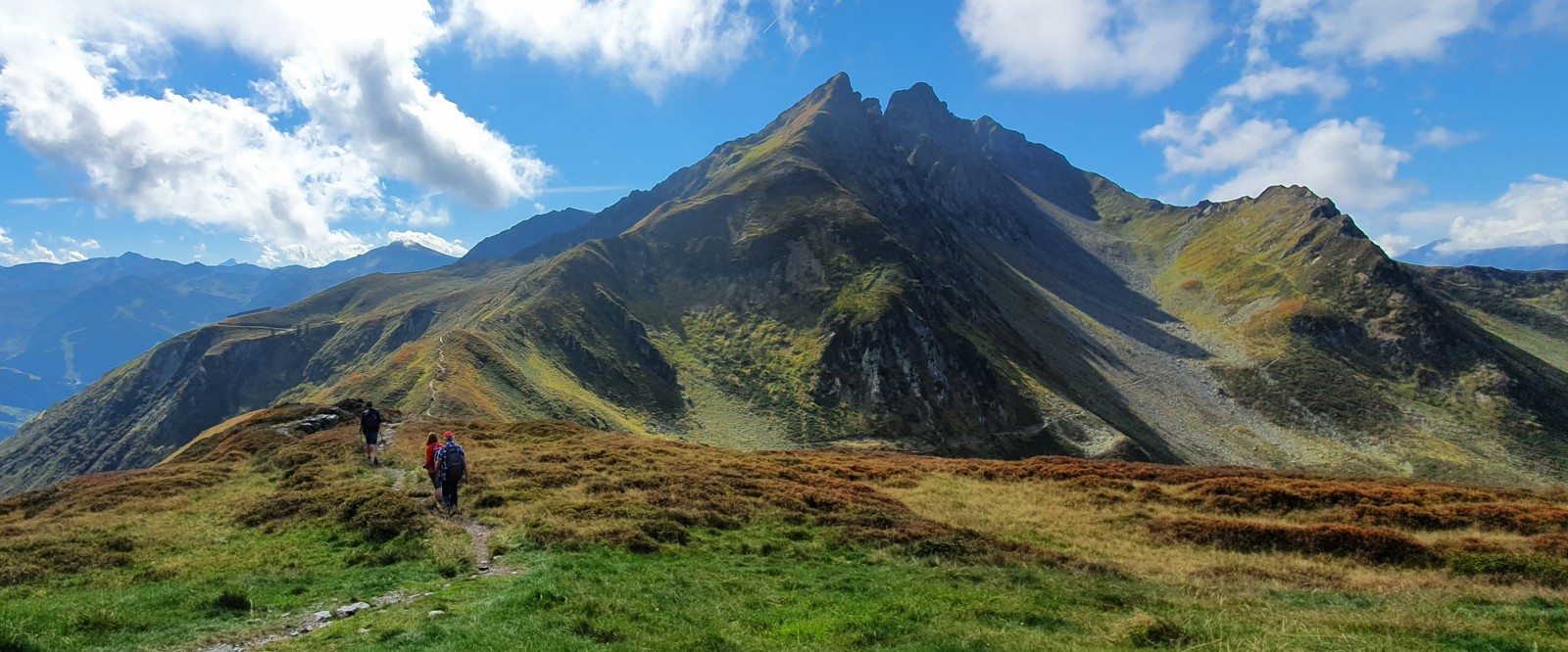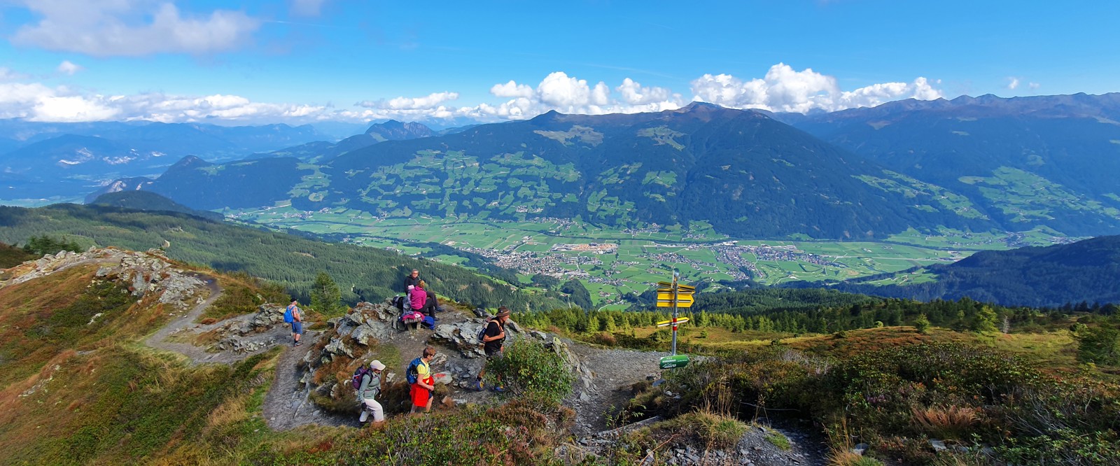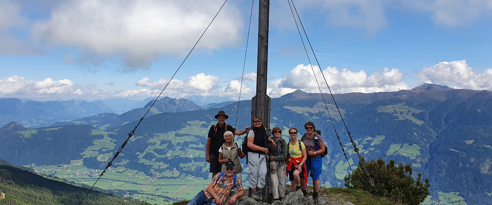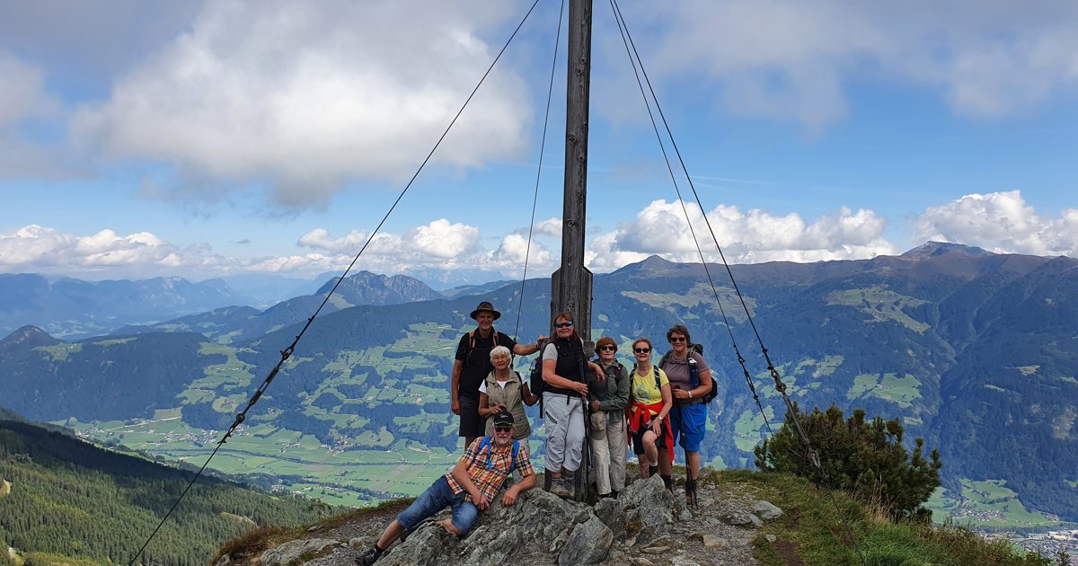 Vi tar linbanan i byn direkt upp till Spieljoch på 1 880 möh. Härifrån börjar vi sedan dagens vandring. En betagande utsikt över dalar och alptoppar väntar oss och vid klart väder har man storslagna vyer. Vandringen går först upp till toppen som blir dagens högsta punkt på knappt 2 000 möh. Vi har då gjort en stigning på cirka 100 meter. På toppen finner vi ett kors, något som är en tradition på många ställen i bland annat Österrike. Här har vi vårt första fotostopp och får en strålande utsikt över bland annat topparna Kitzbüheler Alpen, Tuxler Alpen och en del av Aschensee.