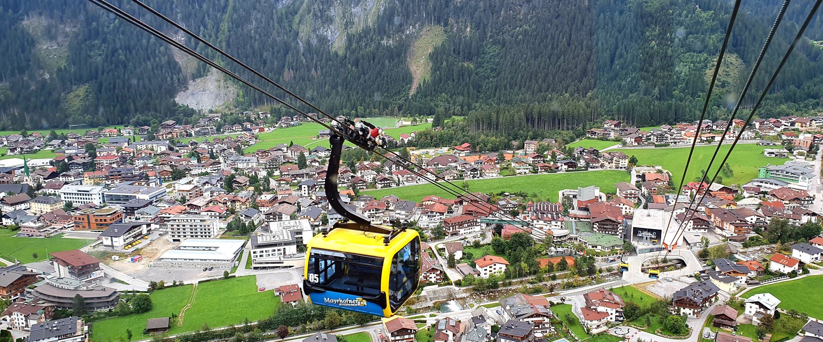 Vi tar Zillertalbahn, ett smalspårigt tåg, från Fügen och tuffar fram i cirka 40 minuter inåt dalen, tills vi når byn Mayerhofen. Byn är ett omtyckt turistmål både sommar och vinter. Vi strosar längs byns affärsgata mot en av Mayerhofens linbanor.