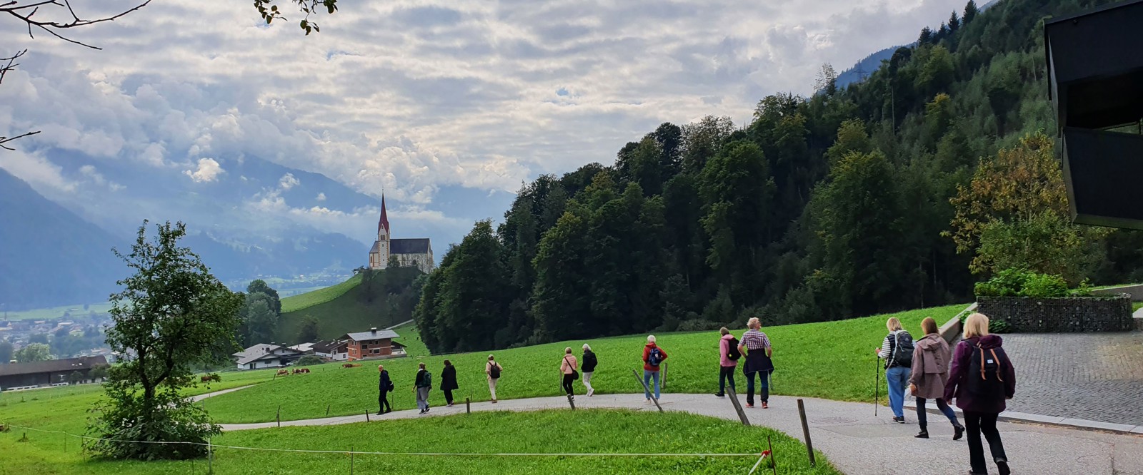 Vi börjar dagen med att bekanta oss med byn och dess omgivningar. Vi startar från hotellet mot Marienbergkirche och fortsätter sedan mot Puzzatal. Underlaget består omväxlande av landsväg och skogsstigar. Färdledaren berättar under vandringen om den lokala kulturen och det vi passerar. Vår vandring tar oss så småningom till Goglhof och på det trevliga Gasthaus Goglhof stannar vi för lunch. Efter en skön lunchpaus bekantar vi oss vidare med byn Fügen och därefter finns det tid på egen hand. Kanske man också vill njuta av hotellets wellnessavdelning.