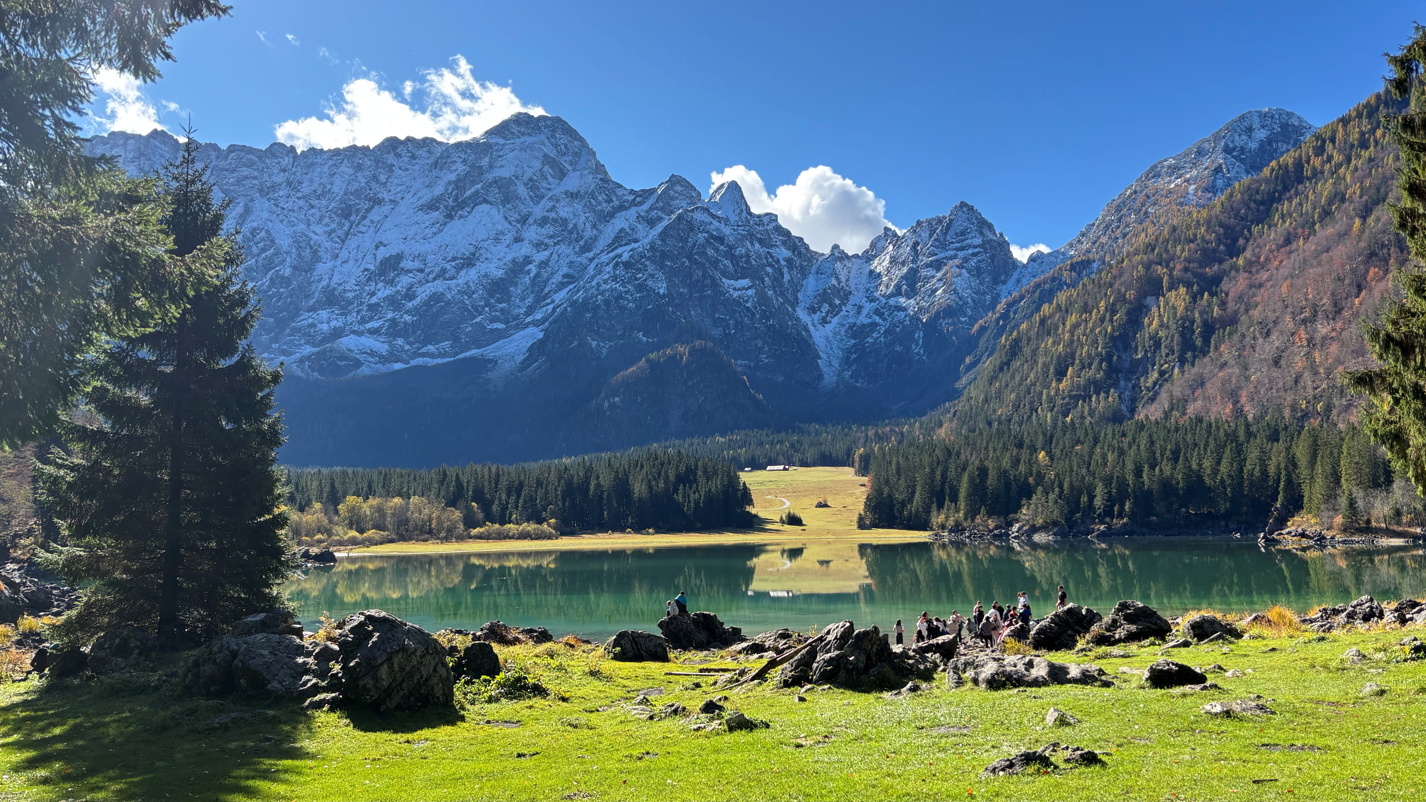 Dagen börjar med en kort transfer över till Italien. Här väntar Fusinesjöarna – två glittrande glaciärsjöar inbäddade under Mangarts dramatiska bergväggar på gränsen mellan Italien och Slovenien. Vi startar vid Lago di Fusine Inferiore och följer en lätt vandringsstig genom skogen. Leden fortsätter, nu lite brantare upp mot Rifugio Alpino, vackert placerad högt ovanför dalen. Efter en välförtjänt paus väljer vi en annan led och med de mäktiga bergstopparna ständigt i synfältet tar vi oss ner igen. Stigen fortsätter sedan runt båda sjöarna – Lago Superiore och Lago Inferiore – där de spegelblanka ytorna återger konturerna av de omgivande bergen. Turen avslutas vid utgångspunkten där vår transfer väntar.