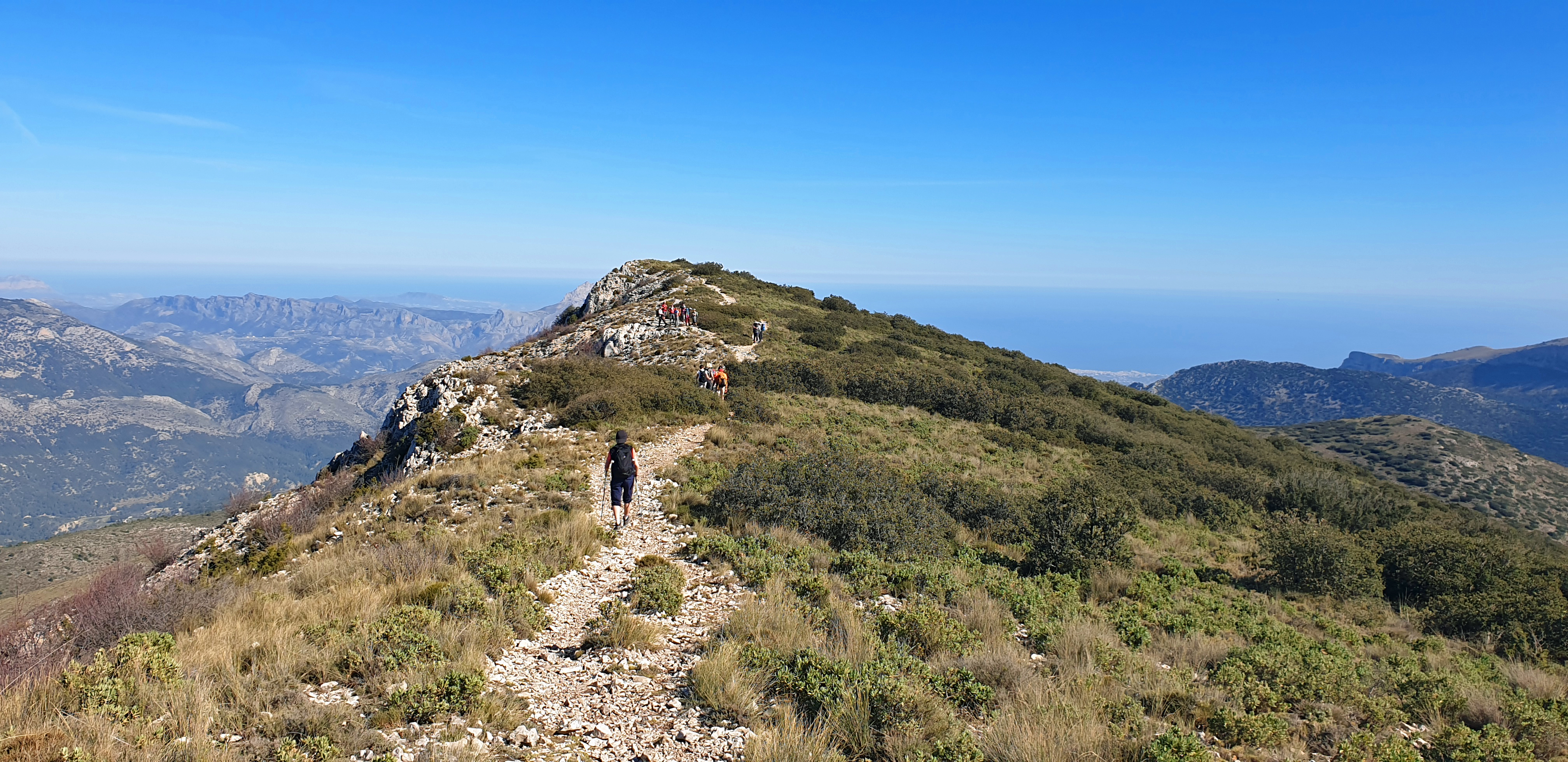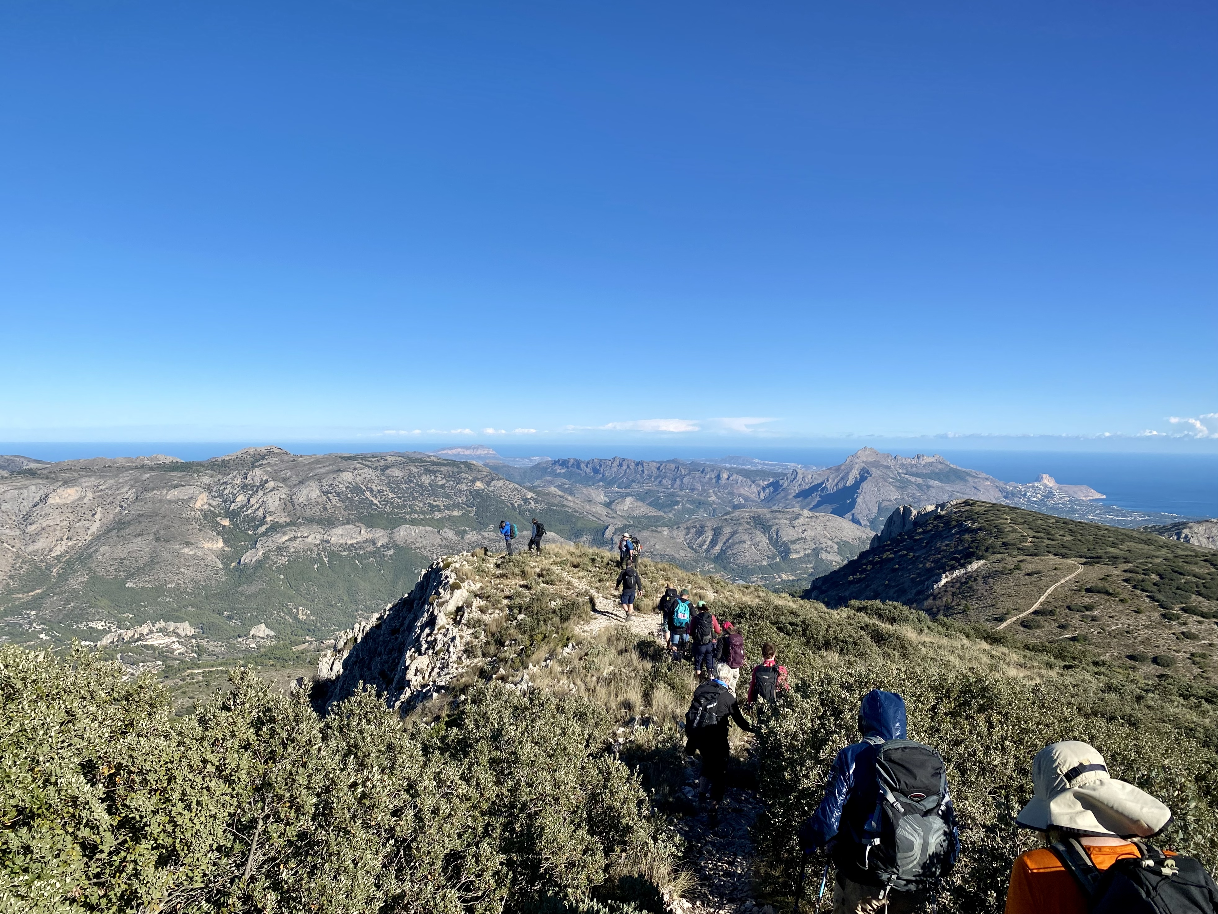 Vi avslutar veckan med en vandring på 18 km som tar oss upp på Alicanteprovinsens högsta berg. Vi börjar från El Font del Molí men tar en annan riktning än första dagen. Vår tur leder oss förbi vackra mandelodlingar och ”isgropar”. Högre upp möter vi veckans vildaste terräng. Stigen försvinner och för att komma upp på berget måste vi gå ett kort parti bland stora ojämna stenblock där man får använda händerna för att ta sig fram. Vi tar det mycket lugnt så att alla klarar av utmaningen. Väl uppe på Sierra d’Aitana tar vi en lång paus för lunch innan vi vandrar vidare längs bergsryggen och tillbaka ner till startpunkten. Höjdskillnaden mellan den lägsta och den högsta punkten är nästan tusen vertikalmeter vilket är veckans högsta. Ikväll äter vi vår avslutningsmiddag på en mysig restaurang i Altea.