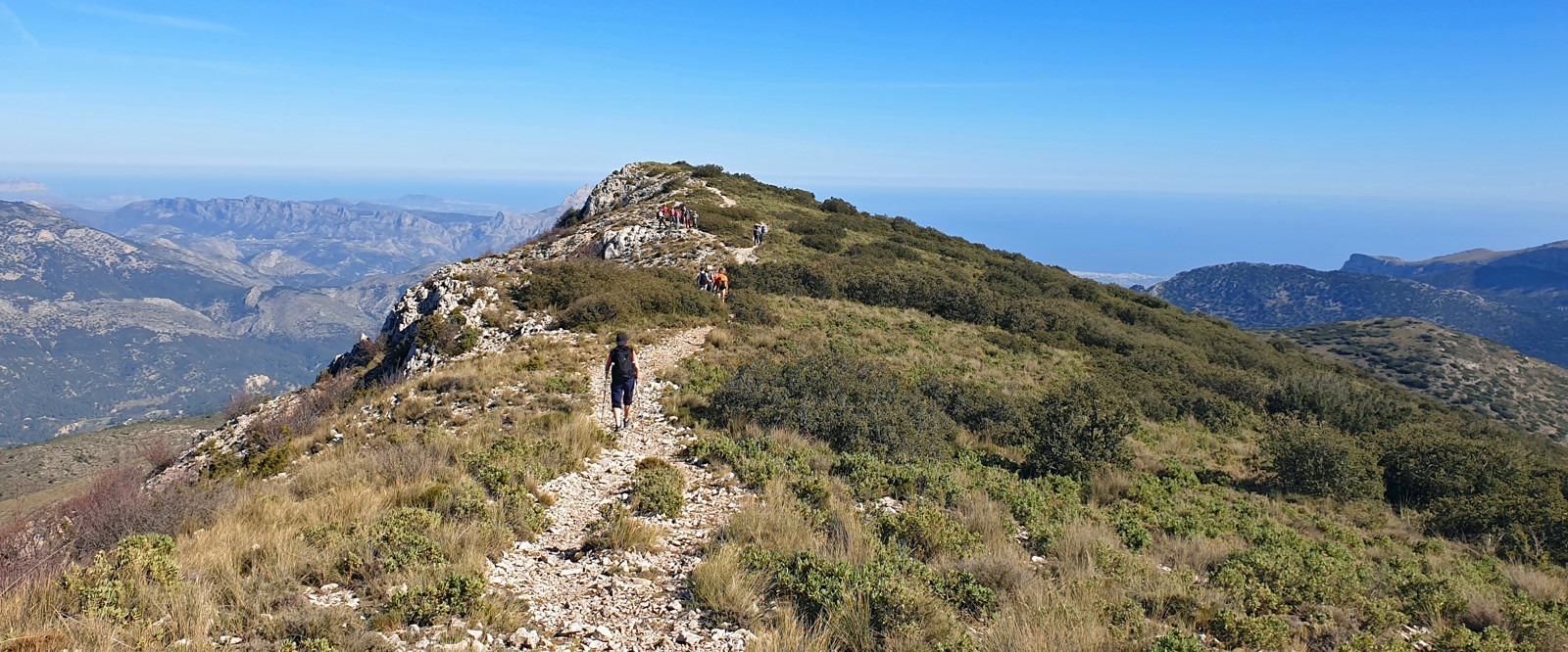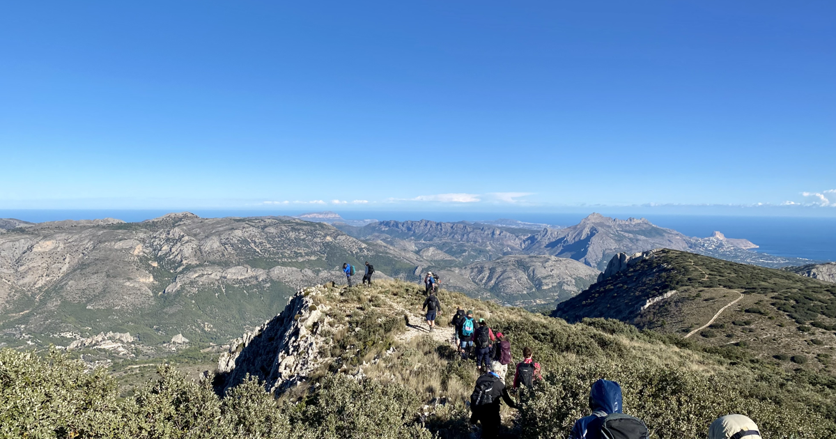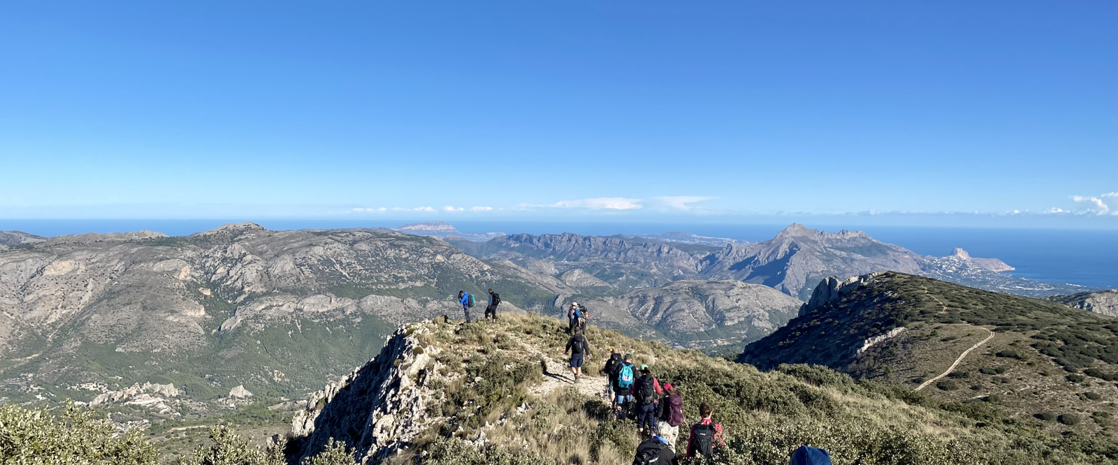 Vi avslutar veckan med en vandring på 18 km som tar oss upp på Alicanteprovinsens högsta berg. Vi börjar från El Font del Molí men tar en annan riktning än första dagen. Vår tur leder oss förbi vackra mandelodlingar och ”isgropar”. Högre upp möter vi veckans vildaste terräng. Stigen försvinner och för att komma upp på berget måste vi gå ett kort parti bland stora ojämna stenblock där man får använda händerna för att ta sig fram. Vi tar det mycket lugnt så att alla klarar av utmaningen. Väl uppe på Sierra d’Aitana tar vi en lång paus för lunch innan vi vandrar vidare längs bergsryggen och tillbaka ner till startpunkten. Höjdskillnaden mellan den lägsta och den högsta punkten är nästan tusen vertikalmeter vilket är veckans högsta. Ikväll äter vi vår avslutningsmiddag på en mysig restaurang i Altea.
