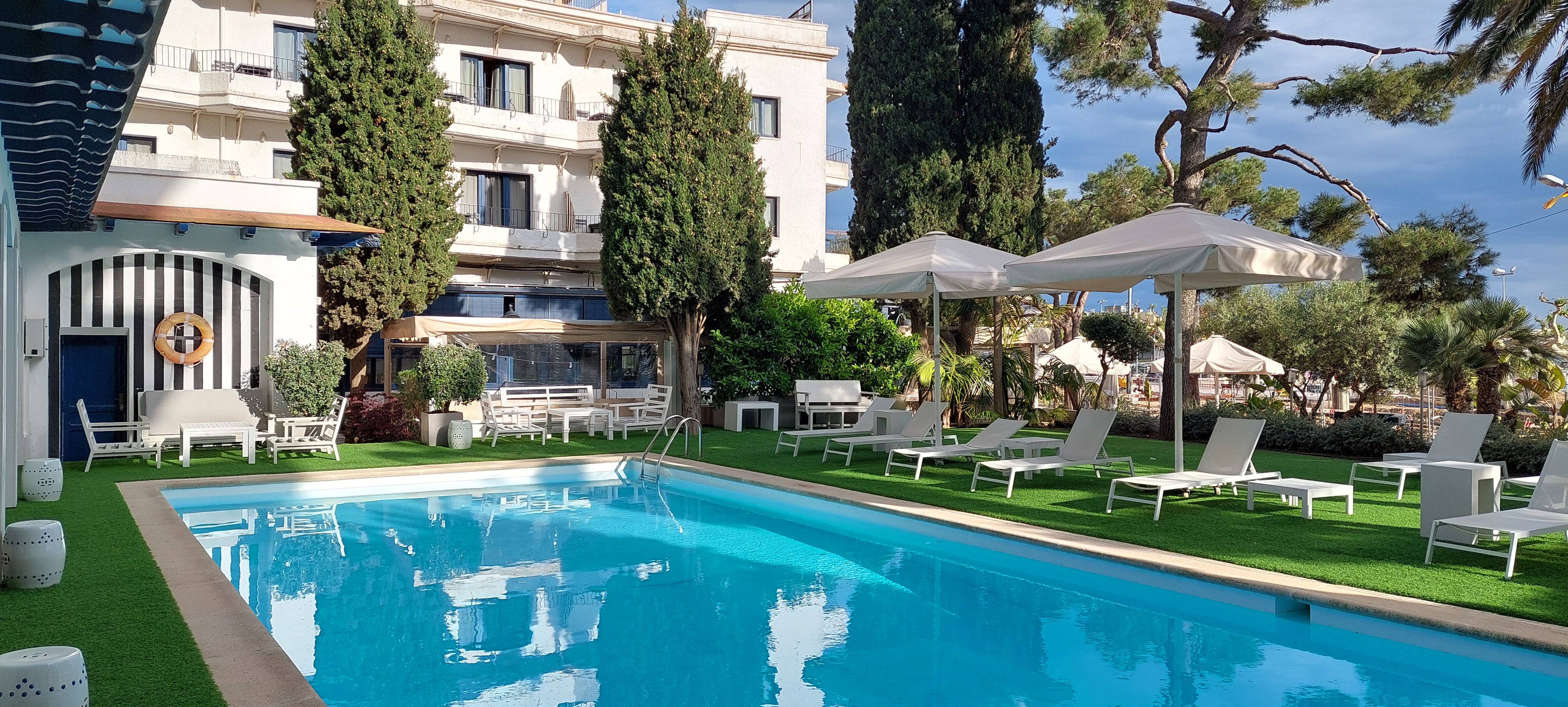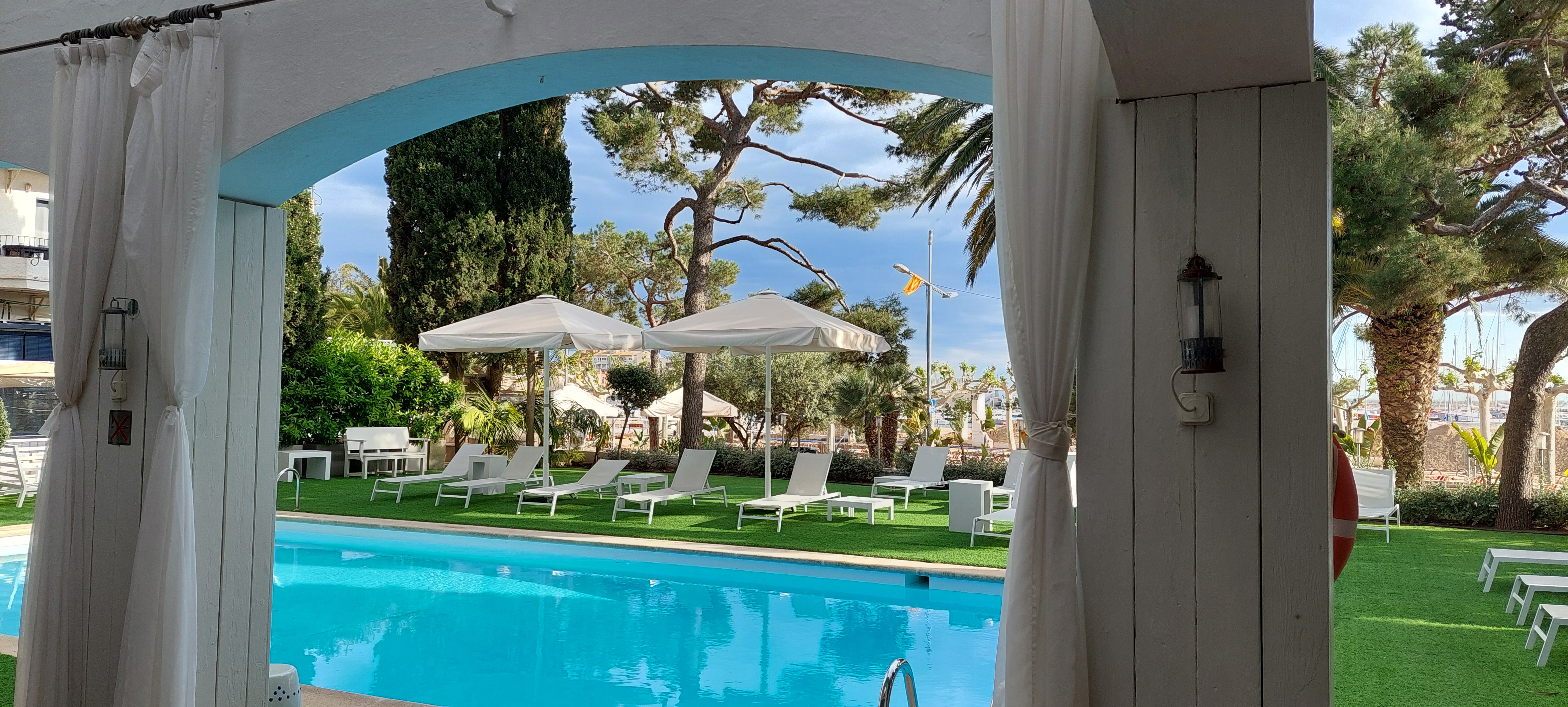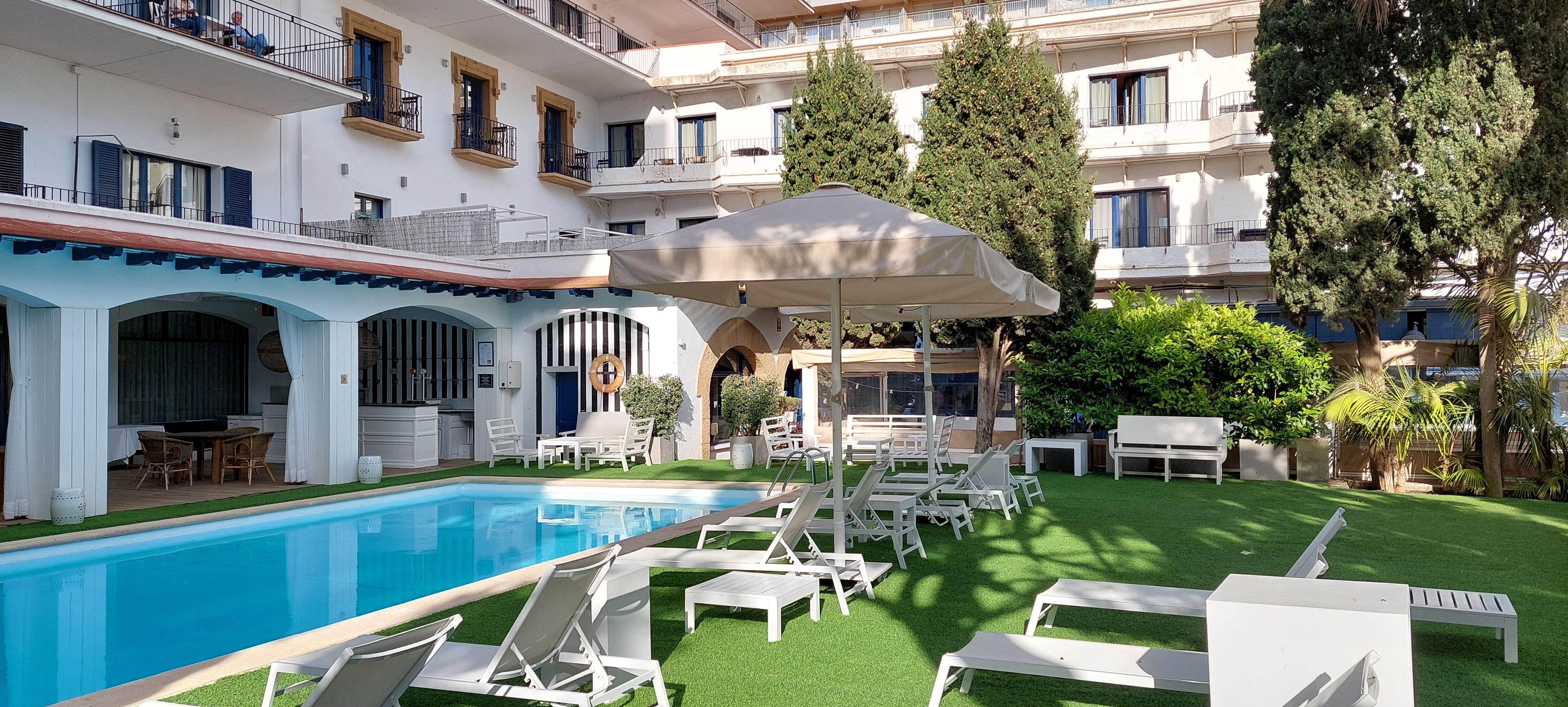 Gästerna uppskattar särskilt balkongerna med mycket vacker utsikt över hamnen och Medelhavet. Restaurangen serverar klassiker från det katalanska köket, där både fisk- och kötträtter står i fokus. En utomhuspool finns men föredrar man att bada i havet är det bara att gå 30 meter över strandpromenaden.