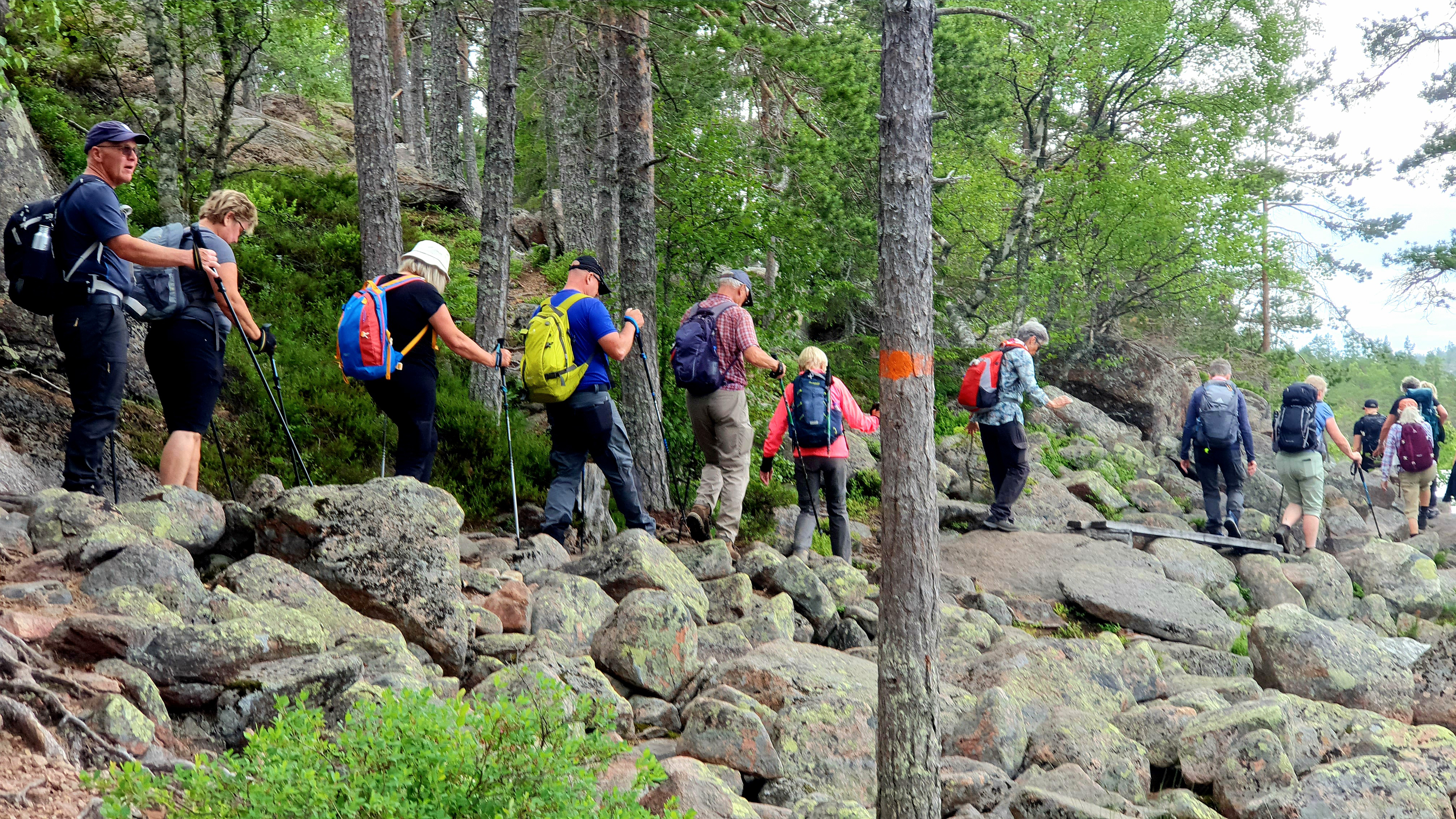 Vi åker med vår egen buss till Skuleberget och startar vår vandring vid besökscentrumet Naturum. Vi vandrar längs södra bergsstigen upp mot toppen. Till en början lättgången stig i skog, som snart övergår till att bli smal och stenig. Här börjar det gå uppför och fortsätter så hela vägen upp till toppen av Skuleberget 295 möh. Mestadels går stigen på öppen klippa och med fina utsikter, förutom en kort sträcka genom skog.