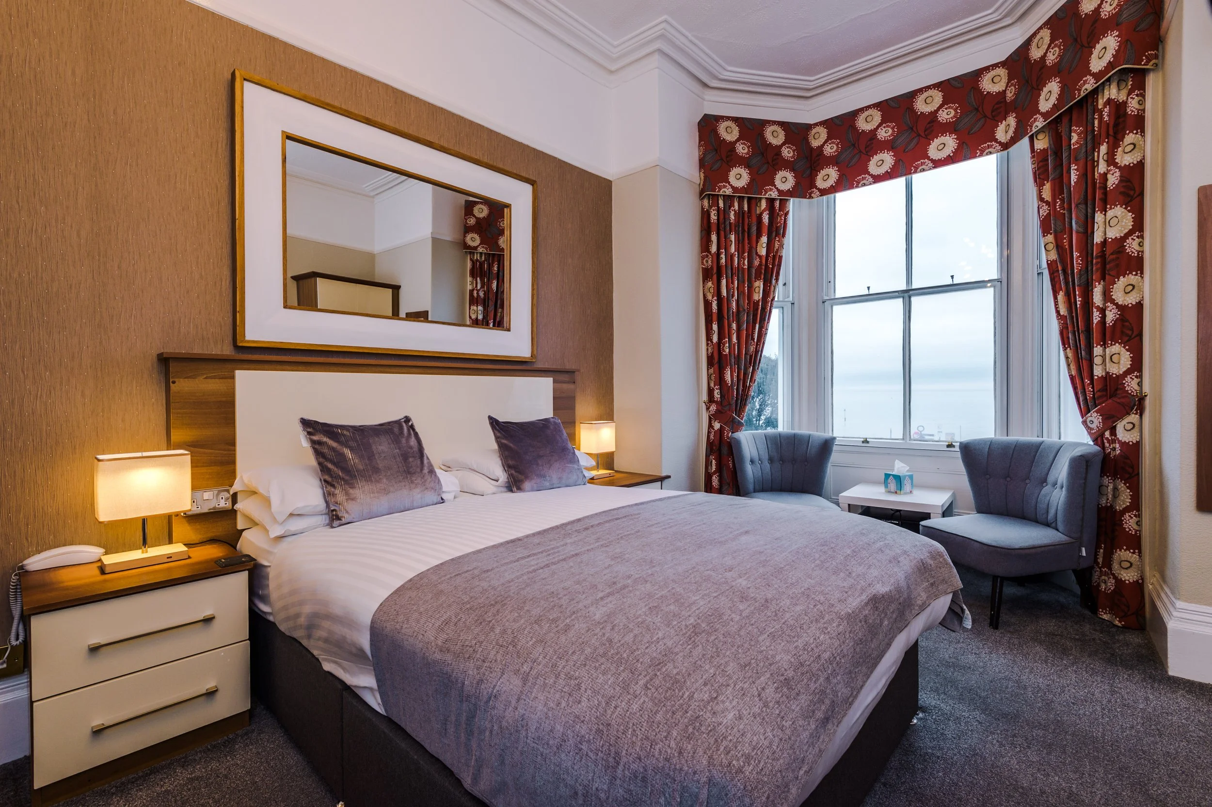 Hotellet erbjuder både standardrum mot baksidan och större och mindre rum med havsutsikt mot framsidan. Varje rum är utrustat med moderna bekvämligheter såsom TV, Wi-Fi, lyxiga toalettartiklar och te- och kaffebricka.